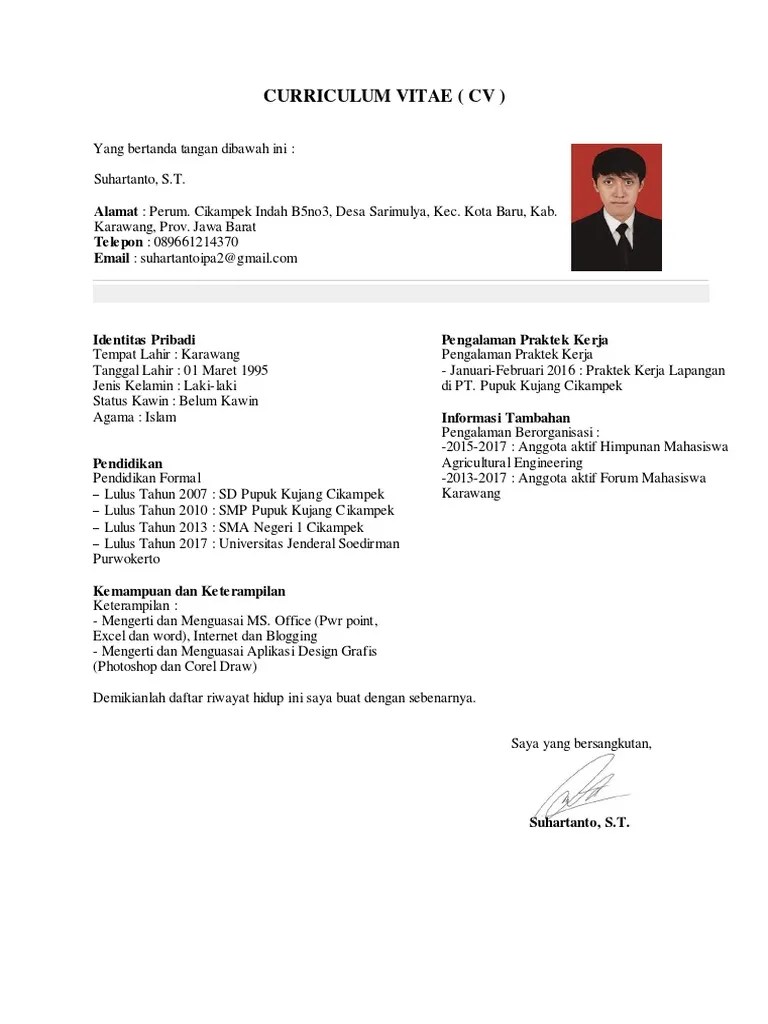 Isinya adalah tentang informasi detail tentang riwayat hidup seseorang. Selama masa kuliah, kita semua akan merasakan yang namanya pkl atau kkn. Pengalaman ini akan menjadi sangat berharga apabila antara apa yang anda kerjakan pada masa pkl atau kkn memiliki keterkaitan bidang studi yang sangat … Dalam prakteknya, sebuah daftar riwayat hidup tidak memiliki format baku. Mar 29, 2018 · pengalaman pkl, magang, atau kkn. Mulai dari data diri, riwayat pendidikan, keahlian yang dimiliki, pengalaman kerja, prestasi, dan lainnya. Yang membedakan adalah apa yang kamu bawa setelah menjalani pkl diperusahaan yang kamu singgahi dan apa yang kamu telah lakukan kepada perusahaan tersebut dan juga untuk universitas kamu. Untuk penulisan manfaat praktek kerja lapangan ini sebenarnya hampir sama dengan penulisan tujuan pkl. Inilah pengalaman kerja penting yang wajib dicantumkan di dalam cv. Contoh 1 penulisan manfaat praktek kerja lapangan